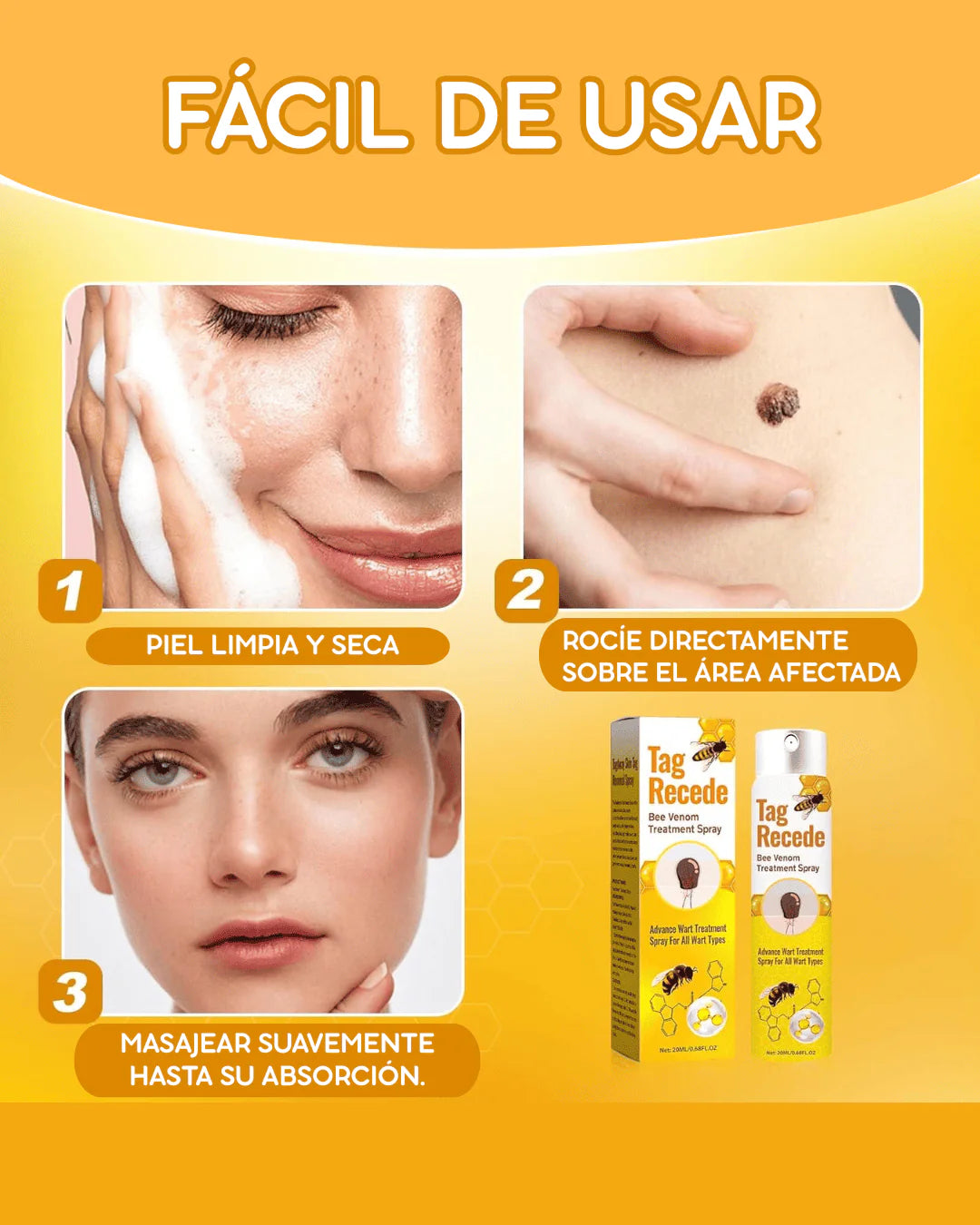 🌿 Ingredientes Naturales y Potentes: Con el poder del veneno de abeja y el ácido salicílico, Tag Recede es una solución efectiva y, a la vez, suave con tu piel.
